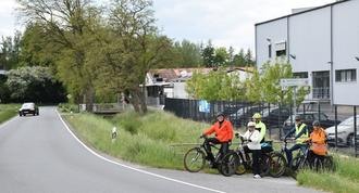 Gut aufpassen: An dieser Stelle in Brensbach kreuzt der Radfernweg R 9 die Landesstraße 3106. Auch die Gruppe mit den Nahmobilitätskoordinatoren des Odenwaldkreises, Markus Linkenheil und Thomas Schuhmacher (erster und zweiter von rechts), muss bei ihrer Radtour auf den Autoverkehr achten.