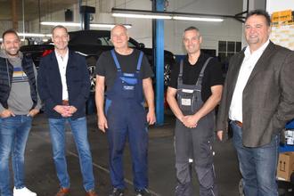 Vertreter des Kommunalen Job-Centers und der InA gGmbH sprachen mit Günther Bechtluft (Mitte), dem Geschäftsführer der Kfz-Werkstatt Bechtluft in Michelstadt, und mit Florian Heß, dem zukünftigen Firmeninhaber, über Mitarbeiterbedarf und Möglichkeiten der Zusammenarbeit. Quelle: Jana Brendel, Kreisverwaltung