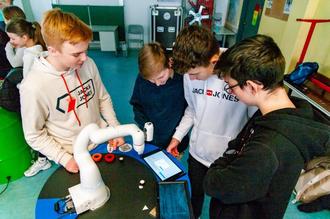 Sichtlich interessiert zeigten sich dabei auch Schüler der Klasse 9e (im Bild), die an der Exponatstation „Work“ einen kollaborativen Roboter programmierten.