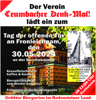 Beginnen wird der besondere Tag mit der Heiligen Messe um 10.00Uhr in der katholischen Kirche in Fränkisch-Crumbach. Danach folgt die feierliche Prozession durch den Park, in dem drei Altäre festlich geschmückt aufgebaut werden. Der erste Altar ist rechts über der Saroltakapelle am Platz der Hohen Gesellschaft vom Rodenstein. Der zweite Altar ist am historischen Theaterplatz, der vor Jahren vom Verein „Crumbacher Denk-Mal!“ wie auch der Rodensteinplatz neu errichtet worden ist. Der letzte Altar ist vor der Saroltakapelle aufgebaut. Hier endet die Prozession mit dem „Te Deum laudamus“ und dem Segen für Teilnehmer und Zuschauer. Der Posaunenchor der evangelischen Kirche Fränkisch-Crumbach begleitet wie immer die Prozession. Danach veranstaltet der Verein „Crumbacher Denk-Mal!“ im Park das Fronleichnamsfest. Hier ist das irdische Zuhause bei Kesselfleisch- und Rindswurst sowie Schinkenschmalzbrot samt dem Bier vom Heiligen Berg (Kloster Andechs) und weiteren Getränken lässt sich der Gaumen erquicken. Aber auch leckere Torten und Kuchen mit Kaffee werden kredenzt. Die Fronleichnamsprozession wurde erstmals 1907 von den Baronessen Ernestine und Franziska von Gemmingen-Hornberg den Gläubigen geschenkt. Schon damals kamen viele Gläubige zu diesem Fest in die Diasporagemeinde, um daran teilzunehmen. Aus dem Konvikt Dieburg, aus Darmstadt, Frankfurt, Mainz und Bingen kamen sie in Scharen nach Fränkisch-Crumbach. 1932 beim 25 jährigen Jubiläum wurde Freiin Franziska von Gemmingen- Hornberg für ihr Engagement der Fronleichnamsprozession in Fränkisch-Crumbach von Papst Pius XI ausgezeichnet. In den Weltkriegsjahren kam es zu Unterbrechungen und bis 1980 fand sie wieder in Fränkisch-Crumbach im Park statt. Danach wurde die Fronleichnamsprozession nach Reichelsheim verlegt und seit 14 Jahren ist sie wieder am ursprünglichen Ort, wo sie noch lange bleiben möge.
