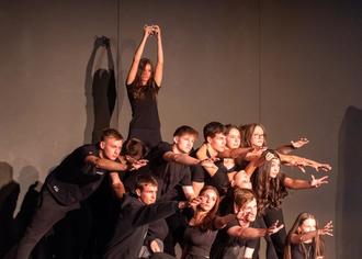 Nach der Pause präsentierte der DS-Kurs der 13. Jahrgangsstufe (Leitung Gsell) sein Stück „Krieg“. Die Szene entstand aus einer Gestaltungsübung gegen Ende der 13. Klasse. Ausgehend von einem Bildimpuls war die Aufgabe, ein Thema zu assoziieren und eine passende Textvorlage zu suchen, um damit eine Szene zu gestalten, die auf Prinzipien des Tanztheaters basiert.