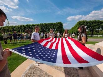 Unser Bild zeigt die Reichelsheimer Schülerinnen und Schüler beim zeremoniellen Falten der Flagge auf dem Amerikanischen Soldatenfriedhof von Romagne-sous-Montfaucon.