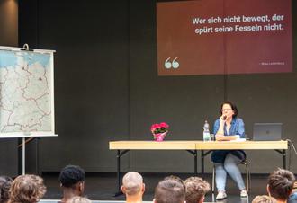 Mit dem Zitat „Wer sich nicht bewegt, spürt seine Fesseln nicht“ begann Brigit Schlicke, Jahrgang 1969, ihren mitreißenden Vortrag. Sie nutzte Rosa Luxemburgs Zitat, um zu verdeutlichen, dass Mitläufer in der DDR ein akzeptables aber auch angepasstes Leben führten. Ihr selbst wurde aufgrund eines Ausreiseantrags ihres Vaters das Abitur verboten. Dennoch kämpfte ihre Familie weiter, um den Unrechtstaat verlassen zu können. Dabei gerieten ihr Vater und sie ins Visier des Geheimdienstes „Stasi“. Aufgrund eines abgefangenen Briefs an eine Menschenrechtsorganisation in Westdeutschland wurde Birgit Schlicke 1988 in das gefürchtete Frauengefängnis Hoheneck inhaftiert. Sie war die jüngste Insassin und mit 2 Jahren und 6 Monaten Strafe kam die gut behütet aufgewachsene 19-Jährige dort erstmals mit Diebinnen, Kindsmörderinnen und einer gefürchteten NS-Verbrecherin in Berührung. Psychoterror, Leibesvisitationen und Zwangsarbeit musste sie über sich ergehen lassen, wie sie in ihrem zweistündigen Vortrag eindrücklich schilderte. „Das Schlimmste war, dass ich in diesem Gefängnis keinerlei Privatsphäre hatte“, trug Schlicke ihrem aufmerksamen Publikum vor. Außerdem habe sie nicht gewusst, wem sie dort überhaupt trauen konnte. Mitte November 1989 wurde die politisch Gefangene entlassen, sodass ihre Familie in den Westen umziehen konnte.