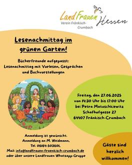 Der Verein LandFrauen Fränkisch-Crumbach lädt zu einem Lesenachmittag im grünen Garten ein. Bücherfreunde erwartet ein Programm mit Vorlesen, Gesprächen und Buchvorstellungen. Besucher sind herzlich eingeladen, ihr Lieblingsbuch für eine kurze Vorstellung mitzubringen.