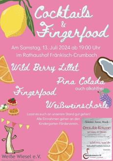 es ist wieder soweit! Am 13. Juli 2024 findet das alljährliche Sommer-Open-Air des Spielmannszuges statt, und wir vom Kita-Förderverein Weiße Wiesel e.V. sind wieder mit dabei. Dieses Jahr möchten wir Ihnen ein besonderes kulinarisches Erlebnis bieten: Genießen Sie köstliches Fingerfood, erfrischende Cocktails und leckere Weißweinschorle an unserem Stand! Mit jeder verkauften Leckerei unterstützen Sie unsere Kita. Die gesamten Einnahmen fließen direkt in Projekte und Anschaffungen, die unseren Kindern zugutekommen.