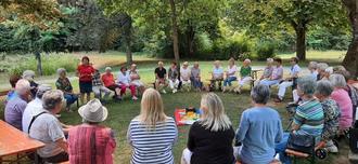 Das Wetter spielte mit und 36 Senioren*Innen waren der Einladung des Seniorenbeirats am Dienstag, 5.7.22 in den Park in der Saroltastraße gefolgt. Bei nur 7 Männern waren die Frauen dabei deutlich in der Überzahl.
