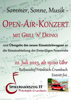 Sie alle sind herzlich eingeladen, zu einem Open Air Konzert, einer Benefizveranstaltung und der Übergabe des neuen Fahrzeuges für das Rettungswesen in Fränkisch-Crumbach.