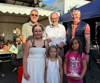 Hermann Könen, der glückliche Gewinner des 1. Preises. Uwe Lotz, Andreas Engel und die Glücksfeen freuen sich mit ihm.