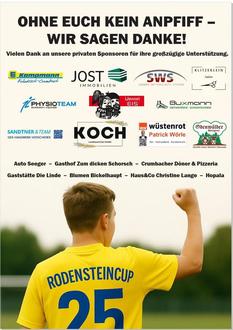 Zum Schluss möchten wir die Gelegenheit nutzen, um uns bei den vielen freiwilligen Helfern, dem „Roten Kreuz“, den Schiedsrichtern, dem Platzwart, den Kuchenspendern, den teilnehmenden Mannschaften, Karl Vogel, Bäckerei Friedrich, Getränke Patschull, Uwe Matuschkewitz, Thomas Henschke, Firma Muntermann, Günter Fässler, dem Bauhof und unseren aufgeführten Sponsoren für den reibungslosen Ablauf und die großartige Unterstützung zu danken.