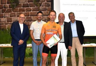 Erster Kreisbeigeordneter Oliver Grobeis (2.v.r.), Kreistagsvorsitzender Rüdiger Holschuh (r.), Fränkisch-Crumbachs Bürgermeister Matthias Horlacher (2.v.l.) und Andreas Gärtner, Erster Vorsitzender der Deutschen Olympischen Gesellschaft (DOG) Kreisgruppe Odenwald, gratulierten Stephan Mertins (M.) vom Mixed-Team des VfL Michelstadt zum Weltmeisterschaftstitel in der Disziplin SwimRun (Teammitglied Gesa Heers fehlte). Foto: Konstantina Koch, Kreisverwaltung