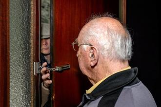 Ein Trickbetrüger in Aktion bei einem gutgläubigen Senior an der Haustür (Symbolbild)