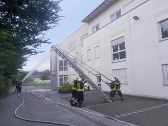 Das nachrückende Löschfahrzeug übernahm den zweiten Abschnitt und begann ebenfalls mit Löschmaßnahmen. Zusätzlich wurde die dreiteilige Schiebeleiter in Stellung gebracht um einen Zugang zum Gebäude zu erhalten und um mögliche Betroffene zu retten.