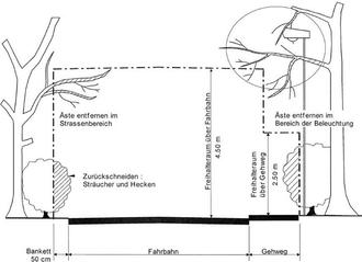 • Sofern Ihr Grundstück an eine öffentliche Verkehrsfläche angrenzt, beachten Sie bitte das Lichtraumprofil. Die Anpflanzungen sollten bis zu einer Höhe von 2,50 m nicht über Rad- bzw. Gehwege ragen und an Straßen nicht bis zu einer Höhe von 4,50 m. Schneiden Sie im Bereich von Straßenleuchten und Verkehrszeichen soweit zurück, dass die Leuchten in ihrer Beleuchtungsfunktion nicht behindert werden und die Verkehrszeichen problemlos aus mehreren Metern Entfernung gesehen werden können. Auch Straßennamenschilder sind Verkehrszeichen und insbesondere für Rettungsdienste im Einsatz nach wie vor sehr wichtig.