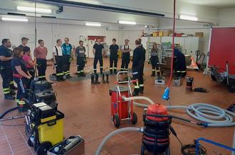 Den Einsatzkräften wurden alle Tauchpumpen vorgeführt und deren Besonderheiten vorgeführt. Weiter ging es mit den Wassersaugern und deren verschiedenen Einsatzmöglichkeiten. Eine Besonderheit stellt der im vergangenen Jahr beschaffte Wassersauger mit Filtermöglichkeit da. Dieser kann beispielsweise dann eingesetzt werden, wenn ein Öltank undicht war und Heizöl auf dem Wasser schwimmt.