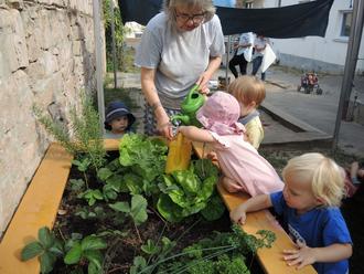 Die Volksbank Odenwald hat der Sarolta-Kindertagesstätte ein Hochbeet geschenkt. Vor einigen Wochen war es soweit, dass es endlich aufgebaut, mit Erde gefüllt und fertig zum Bepflanzen war. Zum Glück haben wir beim Gärtner noch ein paar Kräuter und Salatpflanzen bekommen, dass unsere Erdbeerpflanzen, die auf jeden Fall ins Hochbeet umziehen sollten, nicht so alleine sind.