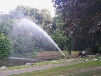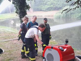 An einer zweiten Station wurde die Handhabung der Tragkraftspritze trainiert. Und nicht nur die Bedienung der Pumpe selbst, sondern auch das Verlegen von Saugschläuchen wurde geübt. Diese werden benötigt, wenn man Wasser aus einem Gewässer pumpen möchte.
