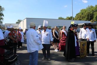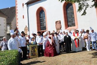 Rund zwanzig Köche und Köchinnen in leuchtend weißer Berufskleidung sowie einige Gäste trafen sich am 10. August auf dem Parkplatz vor dem Edeka-Markt Kampmann und liefen - begleitet durch eine Polizei-Eskorte und den lokalen Ordnungsdienst - in einer stattlichen Prozession durch die Jahn- und Erbacher Straße bis zur evangelischen Kirche, wo sie von einigen, im Schatten wartenden, Crumbachern mit Applaus empfangen wurden. Vorneweg marschierten drei ehrwürdige Ritter des Laurentiusordens: die beiden Fahnenträger Achim Kraus und Christian Zantopp, sowie Hermann Röth mit einer Holzfigur des Heiligen. Zusätzlichen Charme gewann der Marsch durch die Beteiligung der Odenwälder Apfelkönigin Miriam I und der Apfelblütenkönigin Johanna I aus Höchst. Trotz der großen Hitze mitgelaufen waren auch die Geschäftsführerin der Dehoga Südhessen, Christine Friedrich sowie mehrere Mitglieder des Crumbacher Gemeindevorstands. Der ökumenische Gottesdienst wurde von der evangelischen Pfarrerin Dr. Miriam von Nordheim-Diehl aus Wersau gehalten, die den erkrankten Crumbacher Pfarrer Thomas Worch vertrat, und dem katholischen Pfarrer Thomas Weiß aus Klein-Krotzenburg. Dieser ist in Brombachtal aufgewachsen, gelernter Koch und begleitet den Odenwälder Laurentiustag als Seelsorger seit dessen Anfängen vor über dreißig Jahren.