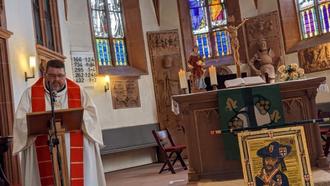 Pfarrer Weiß in einer mit der Fahne der Köche sowie einer Holzfigur des Heiligen Laurentius zusätzlich ausgeschmückten Kirche