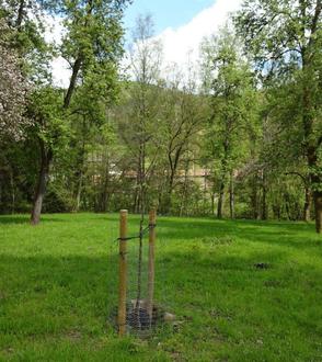 Auf einer Streuobstwiese wurde im Rahmen der Streuobstaktion eine Butterbirne gepflanzt, um den Bestand zu ergänzen.