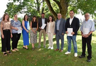 Freuen sich über Fördermittel für wichtige Projekt: Marion Fischer (Bewilligungsstelle im Landratsamt), Anne Aßmus, Ines Günther-Laake und Rekha Krings (IGO), Dr. Jürgen Jung und Bürgermeisterin Deirdre Heckler (Burglandschaft e.V.), Landrat Frank Matiaske, Max Janowicz (Therapiezentrum Janowicz) und Klaus Sauer (Gemeinde Höchst)