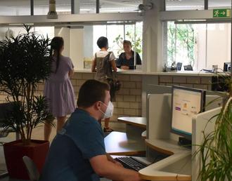 Anlaufstelle: Im Kommunalen Service-Center des Landratsamts werden Bürgerinnen und Bürger in Empfang genommen, die Anliegen rund um die Themen Arbeit und Soziale Sicherung haben. Das Symbolfoto zeigt den Arbeitsalltag am Kommunalen Service-Center, aber zum Schutz des Persönlichkeitsrechts keine Ratsuchenden selbst.