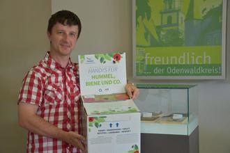 Klimaschutzmanager Markus Linkenheil mit der Sammelbox für alte Handys und Tablets, die im Rahmen der NABU-Aktion „Handys für Hummeln, Biene und Co.“ im Landratsamt in Erbach aufgestellt ist.