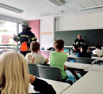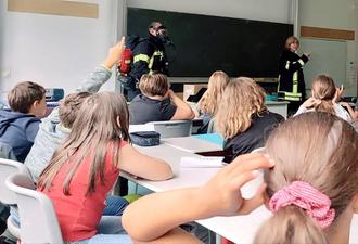 Die Schülerinnen und Schüler lernten zunächst in einem Theorieteil in den jeweiligen Klassenräumen, welche Gefahren es gibt und wie sie sich in einem Brandfall zu verhalten haben.