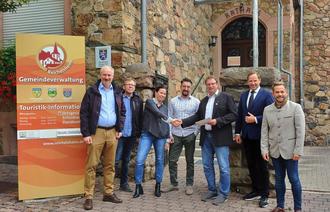 Begrüßung des neuen Jugendpflege-Paars (v.l.n.r): Bürgermeister Eric Engels, Oliver Hülsermann (Geschäftsführer AWO Odenwaldkreis), Carolin Häfner, Daniel Häfner, Bürgermeister Stefan Lopinsky (Gemeinde Reichelsheim), Dirk Daniel Zucht (Erster Vorsitzender AWO Odenwaldkreis), Oliver von Falkenburg (Hauptamtsleiter Reichelsheim)