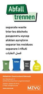 In einem neu aufgelegten Info-Faltblatt erklären wir die wichtigsten Zuordnungen auf einen Blick. Auf zwei Seiten mit jeweils vier Spalten sind die wesentlichen Abfallarten in einer einfachen Bildsprache und mit mehrsprachigen Schlagworten dargestellt. So wird für jeden anschaulich, was in die grüne, blaue und graue Tonne oder auch den gelben Sack gehört - und auch, wo man darüber hinaus anfallenden Abfall hinbringen kann.