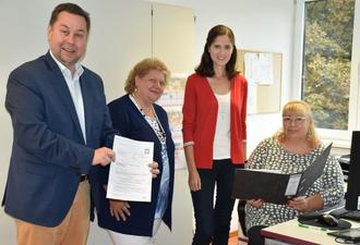 (v. l. n. r.) Michael Vetter, Kreisbeigeordneter für Arbeit und Soziale Sicherung, Sandra Schnellbacher, Hauptabteilungsleiterin Arbeit und Soziale Sicherung, sowie Julia Tilly und Claudia Meier-Ewert vom Maßnahmenmanagement, freuen sich über die zugesagte Fördersumme für die Ausbildungs- und Qualifizierungsangebote.