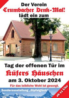 Der Verein „Crumbacher Denk-Mal! e.V. lädt ganz herzlich ab 11.00 Uhr am und im Küfersch Häuschen ein. Neben Weiß- und Rindswurst mit Weck und Brezen gibt es wie immer Bier vom Kloster Andechs und diverse Getränke. Auch Kaffee und Kuchen wird es geben.
