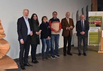 Landrat Frank Matiaske (r.) und Bürgermeister Eric Engels, Fränkisch-Crumbach (l.), würdigen die ehrenamtlich Engagierten im Odenwaldkreis (v.l.n.r.): Sophia Arnold (Weiße Wiesel e. V.), Brigitte Rodenhausen (Notfallseelsorge und Krisenintervention), Uwe Göttmann (Hegegemeinschaft Reichelsheim e. V.) und Dr. Jürgen-Friedrich Kammer (Förderverein Burg Freienstein e. V.).