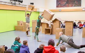 Ausgehend von Franz Kafkas Kurzgeschichte „Der Bau“ thematisierte das Stück das Vorhandensein von Ängsten in uns und wie wir ihnen begegnen, wenn wir uns nicht sicher fühlen und am liebsten verstecken möchten. Das Tanzstück beschrieb auf fabelartige Weise, wie sich ein dachsähnliches Tier getrieben von seiner Angst vor den Bedrohungen durch eine unbekannte Außenwelt immer mehr in einem Labyrinth der Abschottung verirrt. Zwischen Versteckspiel, Festung und Parkour wechselte dabei der mit flexiblen Pappkarton-Elementen gestaltbare Raum. Dabei kam auch zur Geltung, dass mit jedem „Baustein“ das gewohnte Umfeld der Schule zu einem spielerischen Raum der Bewegung und Begegnung wurde.