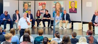 Unser Bild zeigt von links: Anton Stortchilov (DIE LINKE), Frank Diefenbach (Bündnis 90 / Die Grünen), Rüdiger Holschuh (SPD), Moderatorin Marline Busch, Moderator Finn Cress, Sandra Funken (CDU), Moritz Promny (FDP) und Dr. Bernd Engemann (AfD). Im Vordergrund (mit Mikrofon) ist Direktor Herwig Bendl zu sehen. Die Kandidatin der FREIEN WÄHLER, Gina Tomada, war der Einladung leider nicht gefolgt.
