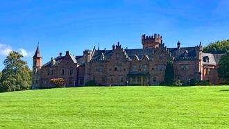 Weiter ging es dann über den Krähberg nach Schöllenbach an der 1465 erbauten Quellkirche vorbei in den badischen Odenwald. Besonders auffallend waren auf dieser kurvenreichen und bei Motorradfahrern beliebten Strecke der Waldreichtum und die Schönheit unseres Odenwaldes. Hinter Keilbach näherten wir uns dem zweiten Ziel, das wahrscheinlich die Wenigsten kannten, dem Schloß Waldleinigen, zu der Gemeinde Mudau gehörig. Auf einer Lichtung mitten im Wald gelegen, ist die heutige psychosomatische Klinik nicht für Besucher mit dem Auto erreichbar. Irmgard Merita hatte bei der Klinikleitung eine Sondergenehmigung erhalten, so dass wir abwechselnd mit den beiden Bussen das wunderschöne Schloß aus der Nähe besichtigen konnten. Das Schloß war im Jahr 1808 ursprünglich als Jagdschloß errichtet worden, wurde dann 1828 abgerissen und von Carl Emerich zu Leinigen als Sommerresidenz im viktorianischen Stil neu erbaut. Vorbild war das bekannte Schloß Windsor bei London. Im letzten Krieg diente es als Wehrmachtslazarett und wird seit 1956 als Sanatorium genutzt.