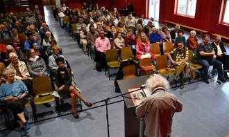 Der Psychiater Dr. Gerhard Bittenbring referiert im vollbesetzen Saal der alten Turnhalle.