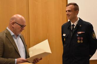 Sven Bardonner verlängert seine Amtszeit als Kreisbrandmeister um weitere fünf Jahre. In dieser Funktion ist er einer der ehrenamtlichen Vertreter von Kreisbandinspektor Horst Friedrich und besonders in Katastrophenlagen und größeren Einsätzen gefordert. Landrat Frank Matiaske überreichte ihm die entsprechende Ernennungsurkunde und zeichnete ihn zudem mit Medaillen für zehnjährigen Einsatz im Katastrophenschutz sowie besondere Verdienste für diesen aus. FOTO: Saskia Hofmann / Kreisverwaltung