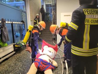Schnell war die Wasserversorgung über den Überflurhydrant auf dem Schulgelände sichergestellt. Dann ging auch schon der erste Trupp mit Atemschutzgeräten in das Gebäude um nach den Vermissten zu suchen.