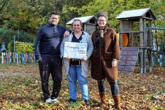 Scheckübergabe von Inga und Arndt Falter an Katharina Schwab, der Leitung des Kindergartens