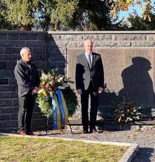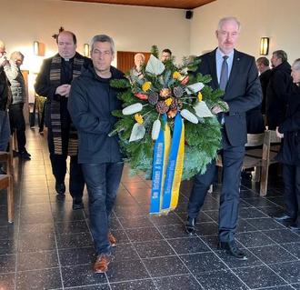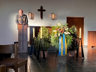 Die Gedenkstunde und Kranzniederlegung am Volkstrauertag ist in Fränkisch-Crumbach feste Tradition. Wenn dabei sonst eher die Erinnerung an die Opfer von Gewaltherrschaft und zweier Weltkriege dominierte, stellte Bürgermeister Eric Engels in seiner Ansprache diesmal die aktuelle Weltlage in den Vordergrund. Er wies darauf hin, dass durch den Überfall Russlands auf sein unabhängiges Nachbarland Ukraine der Krieg mitten nach Europa zurückgekehrt sei und seine Folgen bis zu uns spürbar würden, während auch andernorts, etwa in Taiwan, die Anwendung von Waffengewalt nicht grundsätzlich ausgeschlossen werde. Es mache besorgt, wenn schon wieder über nukleare Bedrohungen spekuliert werde, während zugleich die Versorgung mit Nahrungsmitteln und Energie als Druckmittel missbraucht werde, ebenso wie massenhafte Fluchtbewegungen. Der Volkstrauertag sei Anlass und Gelegenheit, enger zusammenzurücken und diese Ungewissheiten gemeinsam einzuordnen. Im Anschluss an seine Rede sprach der katholische Pfarrer Jozef Koscielny eine Andacht und schloss mit einem gemeinsamen Gebet. Bei der Kranzniederlegung am Ehrenmal ging dem Bürgermeister diesmal der stellvertretende Vorsitzende der Gemeindevertretung Stefan Rink zur Seite. Musikalisch umrahmt wurde die Gedenkfeier wie seither vom Evangelischen Posaunenchor unter der Leitung von Johannes Würmseer.