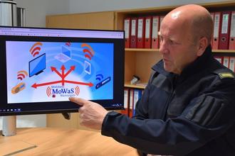 Warn-Wege: Der stellvertretende Kreisbrandinspektor Norbert Heinkel erläutert in der Zentralen Leitstelle, wie das Warnsystem MoWas funktioniert, über das der Odenwaldkreis Warnungen an die Bevölkerung weitergibt.