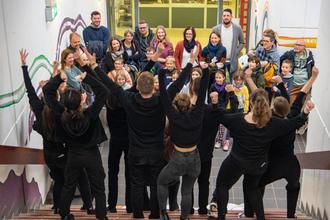 Unser Bild zeigt eine Besuchergruppe während der Darbietung der Fachschaft „Darstellendes Spiel“ am Treppenaufgang zu den Klassenräumen.