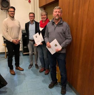 (v.l.n.r. Bürgermeister Matthias Horlacher, Vorsitzender der Gemeindevertretung Patrick Eckert, Hanne Schirmer, Dr. Heinz-Erich Erbs