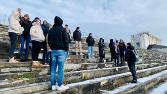 Besichtigt wurde schließlich auch das „Zeppelinfeld“ (im Bild), wo die Schülerinnen und Schüler auf der noch vorhandenen Zeppelintribüne weitere Informationen der Guides erhielten und Fragen stellen konnten.