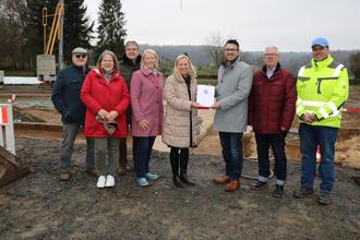 Von links nach rechts: Achim Weidmann, Ottilie Röhner, Rüdiger Holschuh, Ulrike Büchner, Staatsministerin Diana Stolz, Bürgermeister Matthias Horlacher, Thomas Wießmann und Florian Lösel