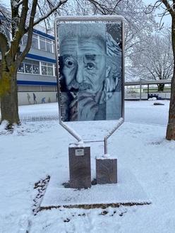 Im Schuljahr 2021/23 hat die damalige E-Phase Kunst den Auftrag für eine große, repräsentative Arbeit/Skulptur für den Rundhof der Albert-Einstein-Schule bekommen, was sie mit Begeisterung angenommen und mit Erfolg durchgeführt hat. Entwurf und Prototyp waren reine Schülerarbeit. Die Realisierung des endgültigen Objektes, ein Einstein Kopf als Keramickdruck mit Stahlfassung und ein Podest aus Granit mit dem Titel „wir“, wurde dann extern produziert.
