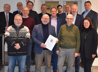 Gemeinsam für Fachkräftsicherung in der Verwaltung: Landrat Frank Matiaske (mit dem Förderbescheid in den Händen) im Kreis der Bürgermeister (von links) Axel Muhn, Horst Bitsch, Rainer Müller, Dr. Peter Traub, Dr. Tobias Robischon, Andreas Koch, Christian Kehrer, (Valentin Kuffer, Landratsamt), Dietmar Bareis, Uwe Olt, Eric Engels, Deirdre Heckler und Stefan Lopinsky.
