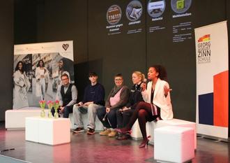 Im Anschluss fand eine Podiumsdiskussion statt. Daran beteiligten sich Direktor Patrick Eckert (stellvertretender Schulleiter), Kerstin Baltz von der Schulsozialarbeit sowie Carina Will (Schutzfrau der Polizei in Reichelsheim). Moderiert wurde die Diskussion von Schulsprecher Johann Leist. Deutlich wurde dabei, wie wichtig es ist, bei digitaler Gewalt nicht wegzuschauen, sondern Verantwortung zu übernehmen und Betroffene aktiv zu unterstützen.