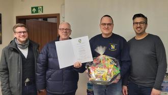 Bürgermeister Matthias Horlacher überraschte Stephan Fehr gemeinsam mit dem Ersten Beigeordneten Thomas Wießmann sowie dem Vorsitzenden der Gemeindevertretung Patrick Eckert vor einem angesetzten Unterricht der Einsatzabteilung, um ihm für seine langjährigen Verdienste zu danken. Im Rahmen dieser besonderen Gelegenheit überreichten sie ihm eine Urkunde als Zeichen der Anerkennung sowie einen Präsentkorb, der auf den Gemeindebrandinspektor abgestimmt war.