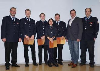 Das Bild zeigt unsere neuen Feuerwehrleute bei der Übergabe der Beförderungen v.l.n.r.: Gemeindebrandinspektor Holger Zieres, René Schulz, Jessica Glenz, Aylin Lentes und Martin Obenauer, Bürgermeister Stefan Lopinsky und Wehrführer Sören Erbeldinger. Bemerkenswert ist, dass drei der 4 neuen Kräfte Quereinsteiger sind, also keine klassische Laufbahn über Mini- und Jugendfeuerwehr durchlaufen haben, sondern "erst" im Erwachsenenalter den Weg zur Feuerwehr gefunden haben.